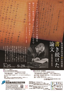 西田幾多郎は一九四五(昭和二十)年六月七日、鎌倉の自宅で亡くなりました。七十五歳の生涯を終える直前まで、幾多郎は自らの考えを形にし、それを後輩たちに理解してもらいたいと願いながら、必死に書き続けました。同時に、戦況が悪化し紙の配給が途絶えるなかで、幾多郎の論文刊行に尽力した多くの人々がいました。幾多郎の決死の覚悟と、その願いを叶えようと奔走する彼等の姿を紹介します。